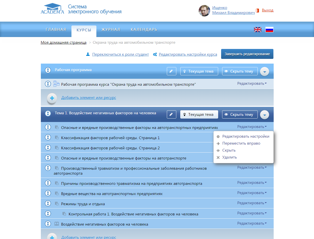 При клике на ссылку «Редактировать» открывается выпадающее меню с инструментами редактирования учебного элемента, назначение которых пояснено далее |