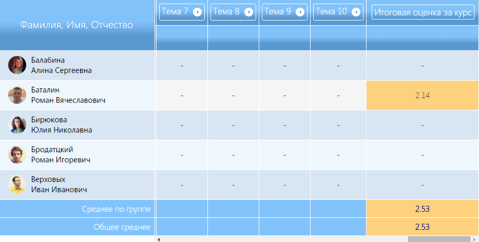 На одной странице «Отчета по оценкам» одновременно выводятся фамилии, имена и отчества пяти студентов, в ячейках указываются средние оценки студента за тему. Чтобы узнать детальную статистику знаний по какой-либо из тем, необходимо кликнуть по номеру этой темы, тема «разворачивается» и можно увидеть оценки студента за прохождение учебных элементов данной темы. Для того, чтобы скрыть детальную статистику повторно кликните по номеру темы.