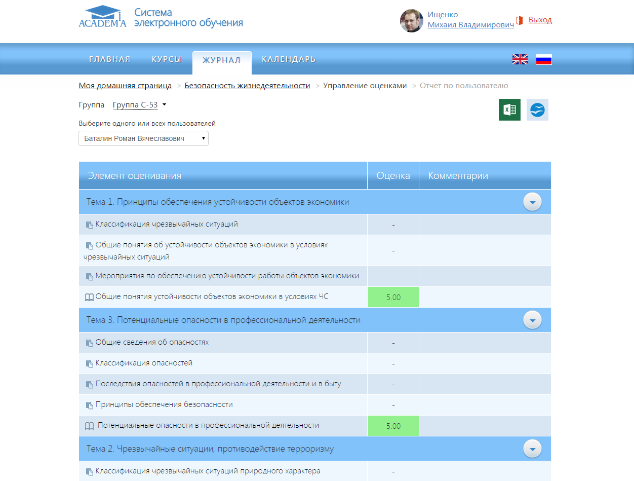 Можно экспортировать «Отчет по оценкам» в таблицу программы Excel (формат CSV) или таблицу программы OpenDocument, для чего необходимо нажать на соответствующую кнопку экспорта в верхней части страницы (рис. 31).