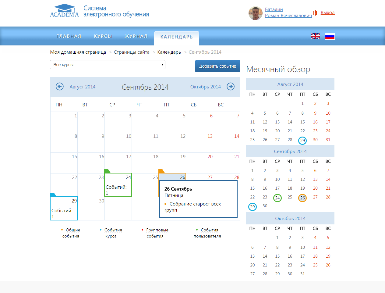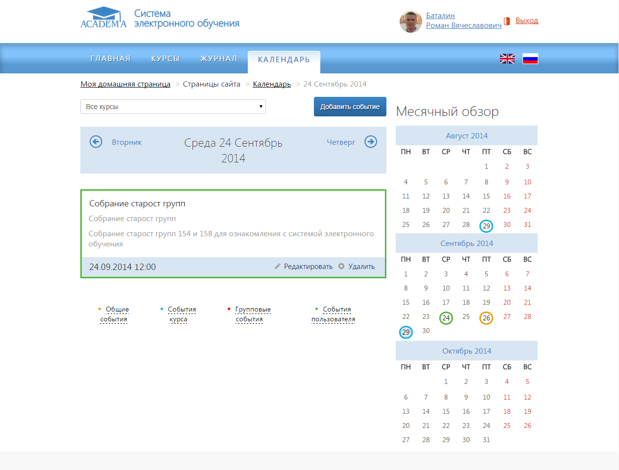 В разделе «Календарь» отображаются события СЭО, курса, групповые события и собственные события пользователя: начало занятий, коллоквиум, зачет, пересдача и др. (рис. 33). Любой пользователь СЭО может использовать календарь как собственный блокнот, записывая в него информацию о своих собственных событиях — события пользователя.
