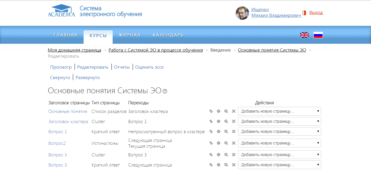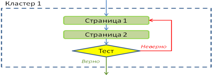 Элемент «Лекция» состоит из нескольких кластеров, в каждом из которых имеется набор страниц и тестовых заданий. Под кластером может пониматься один из разделов лекции. Внутри кластера можно переходить от одной страницы к другой. В конце кластера помещается тестовое задание: