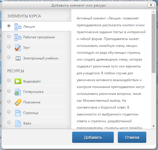 Добавление «Лекции», также, как и других интерактивных элементов учебного курса, осуществляется в режиме редактирования. В нужной теме курса нажмите на кнопку «Добавить элемент или ресурс». В открывшемся модальном окне (рис. 74) в списке «Элементы курса» выберите элемент «Лекция» и нажмите кнопку «Добавить».
