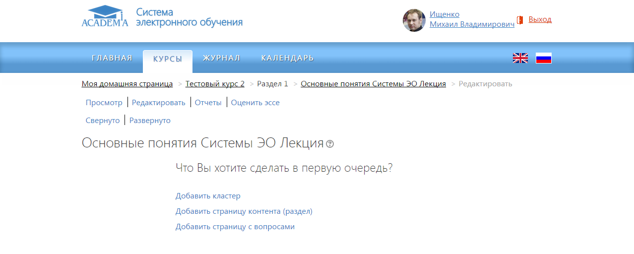 После того как необходимые настройки выполнены, нажмите на кнопку «Сохранить и показать». Загрузится страница создания структуры лекции (рис. 77), где можно выбрать тип структурного элемента лекции, который будет создан в первую очередь. Например, можно добавить кластер, страницу контента (раздел) или страницу с вопросами.
