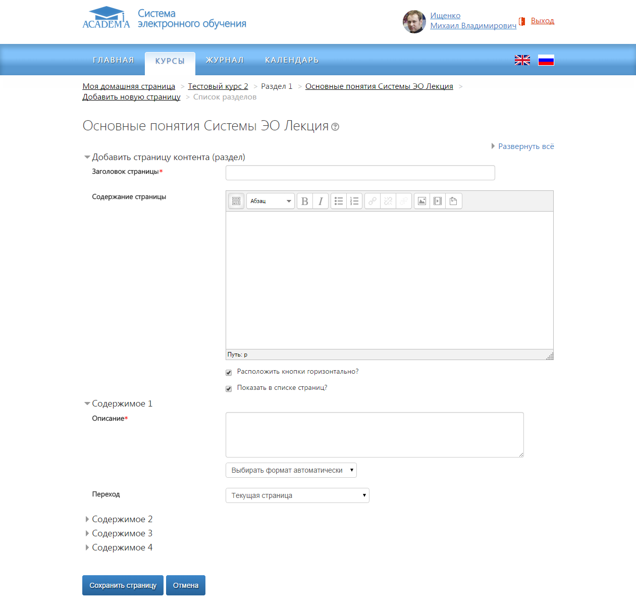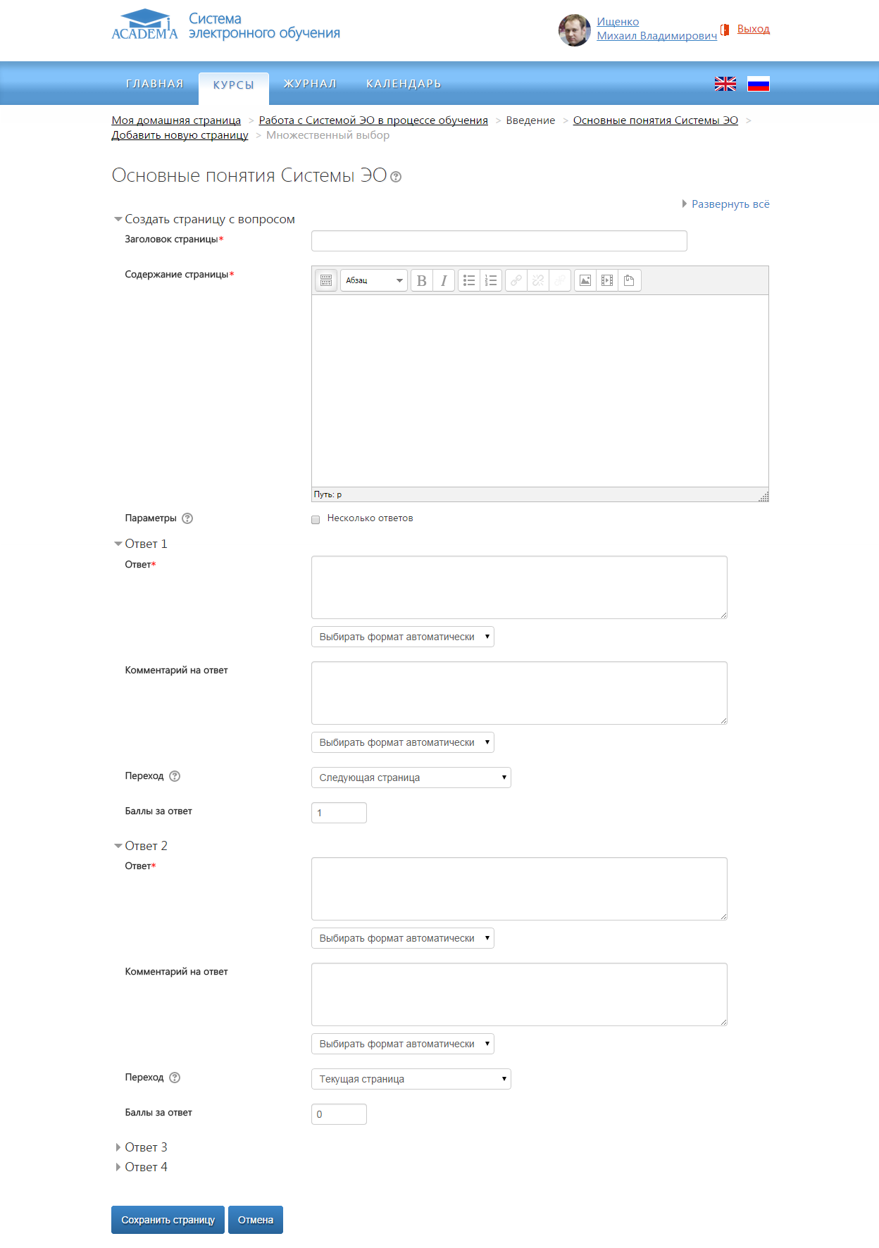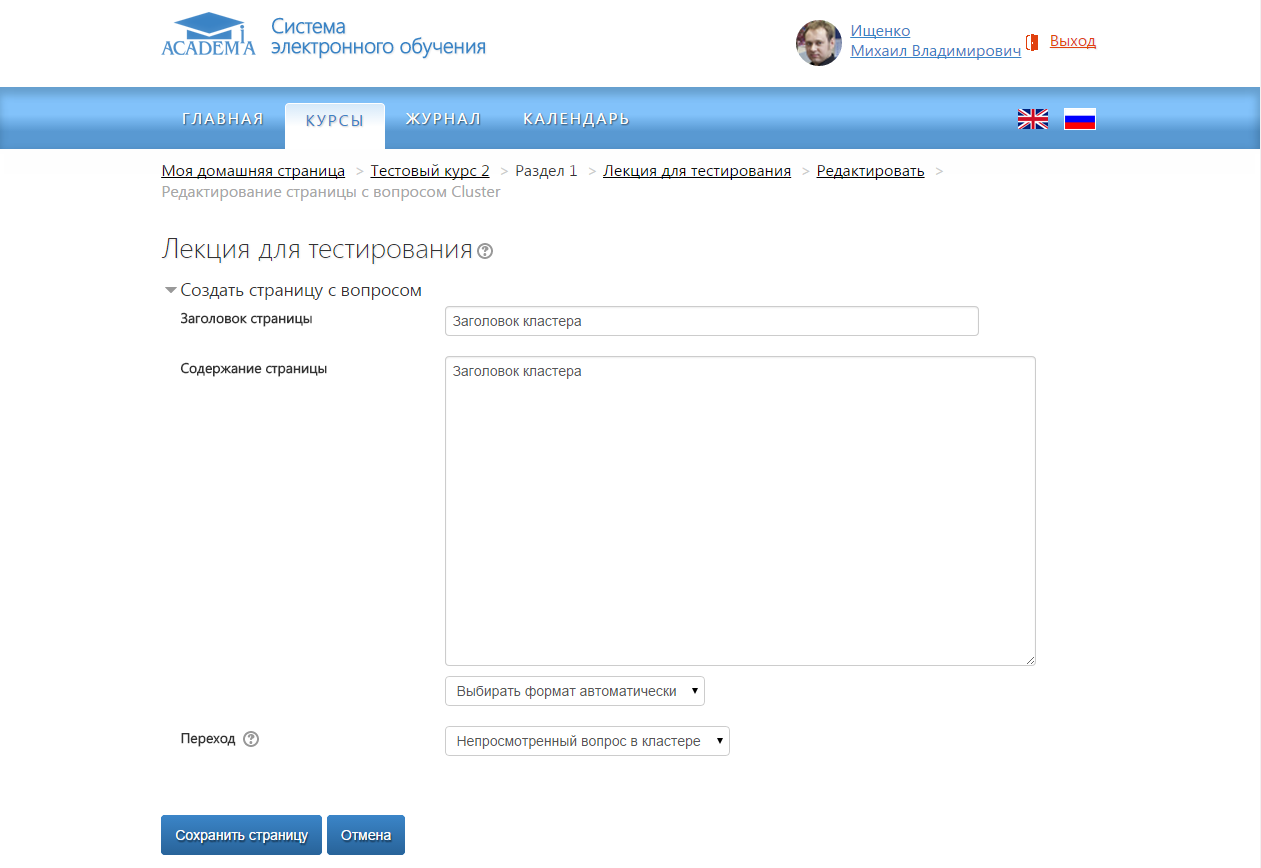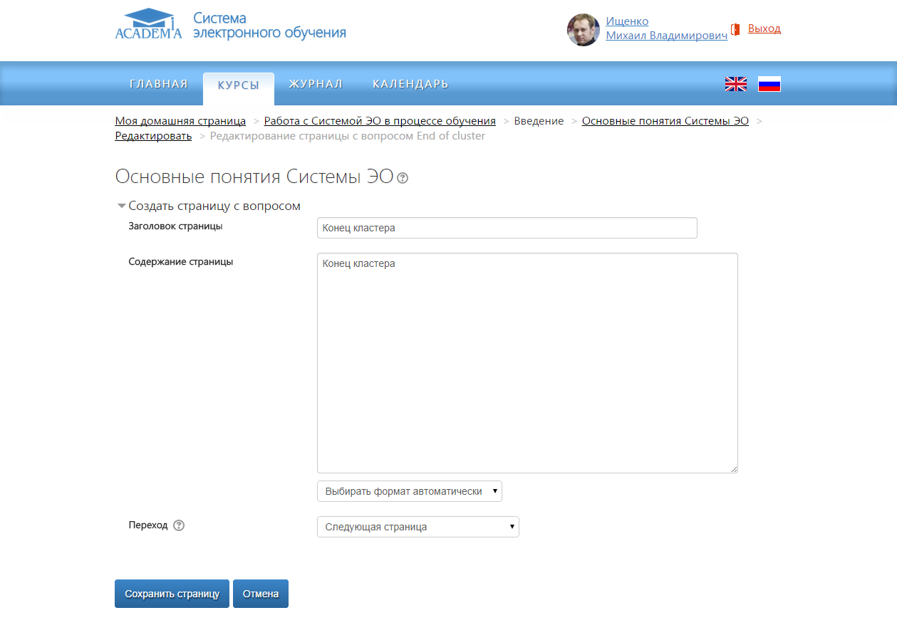 На этой странице можно ввести ее заголовок и содержание, а также задать переход, т.е. обозначить страницу, на которую попадет Студент при выходе из кластера.