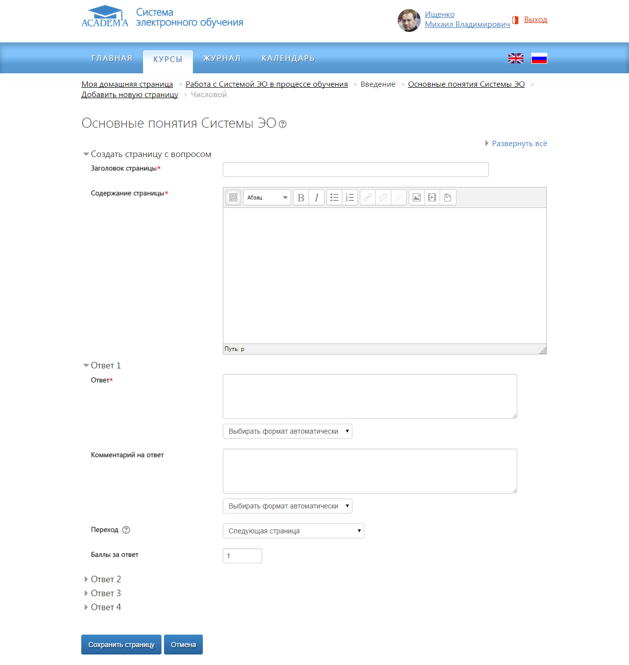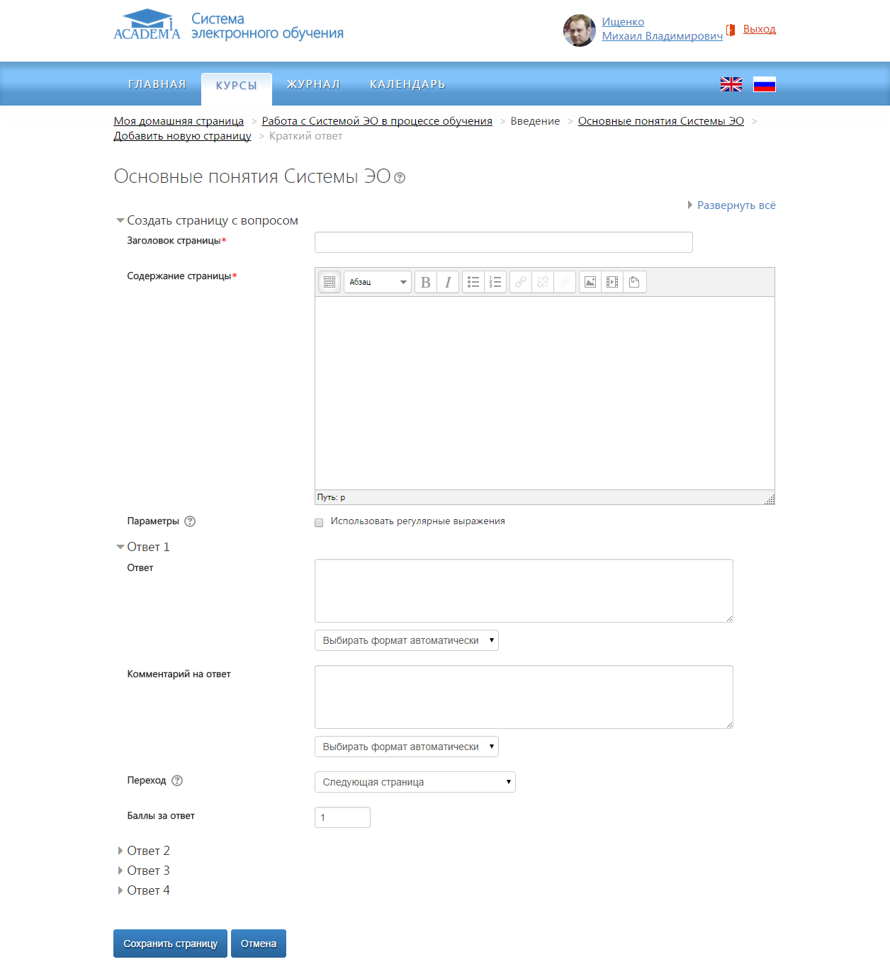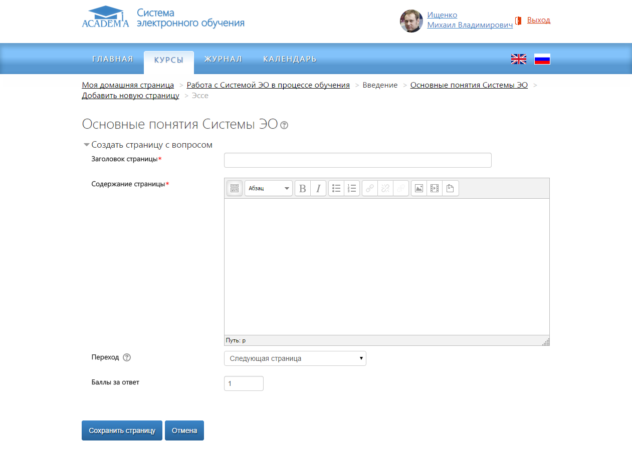 На этой странице можно ввести ее заголовок и содержание, а также задать переход, т.е. обозначить страницу, на которую попадет Студент при выходе из кластера.