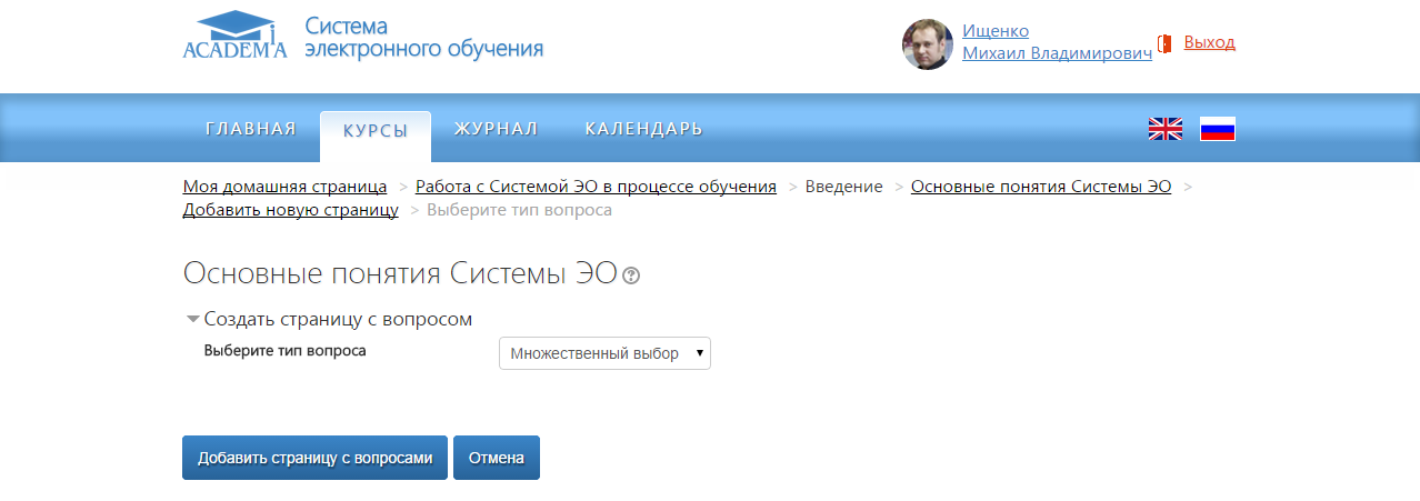 Для дополнения вопроса выберите в выпадающем списке «Добавить новую страницу» пункт «Вопрос», и на открывшейся странице (рис. 82) укажите тип вопроса.
