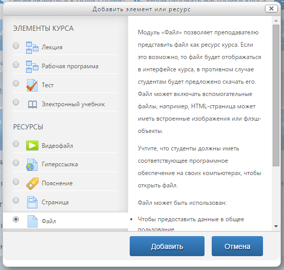 Добавления в модуле «Файл» осуществляются в режиме редактирования, для чего в выбранной теме курса нажмите на кнопку «Добавить элемент или ресурс». В открывшемся модальном окне (рис. 111) в списке «Ресурсы» выберите элемент «Файл» и нажмите кнопку «Добавить».