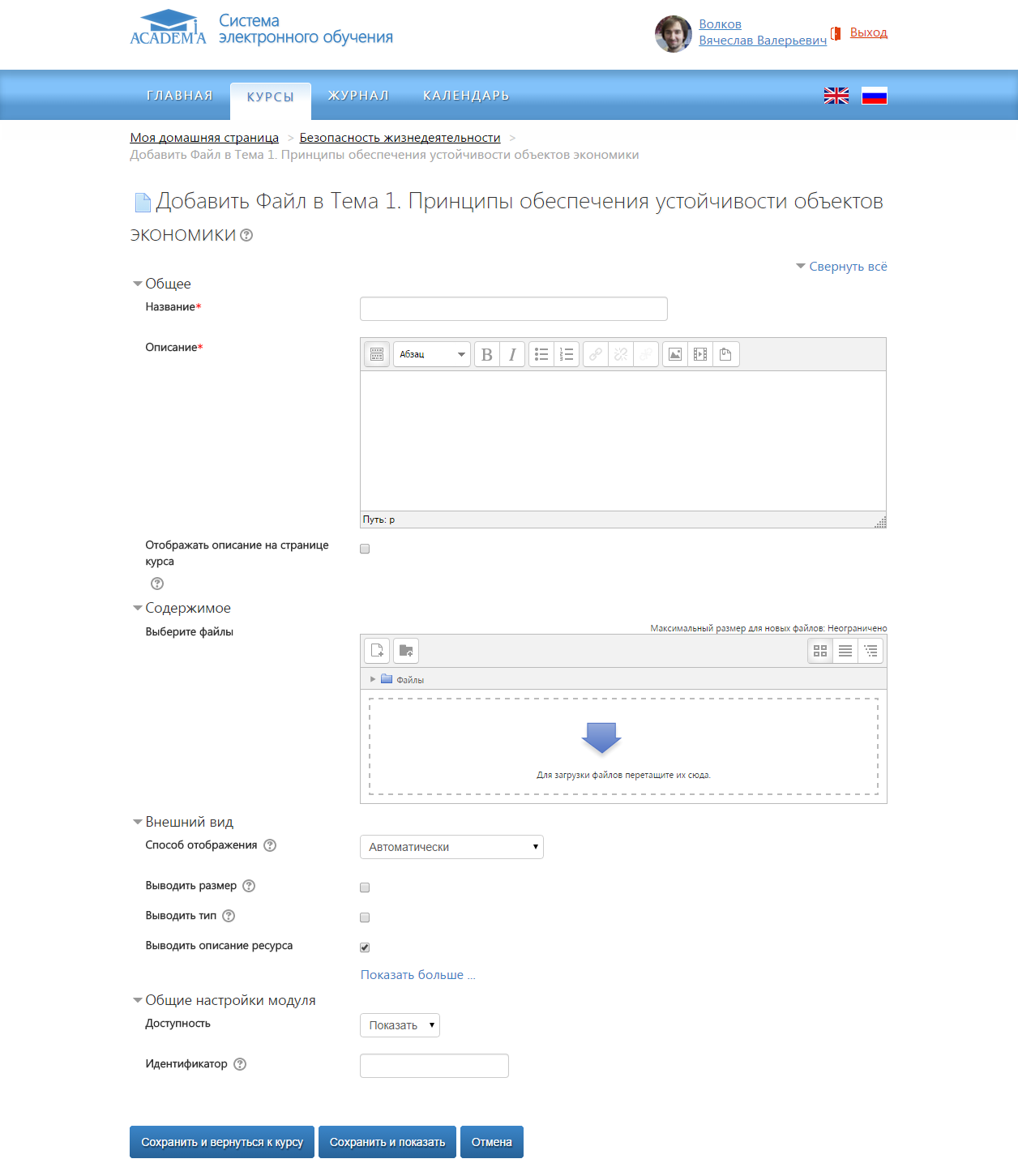 «Отображать описание на странице курса» — позволяет выводить описание файла в структуре учебного курса;