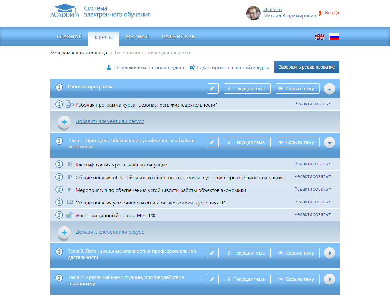 Для перехода в режим редактирования нажмите на кнопку «Режим редактирования» в верхней части страницы «Курсы» (рис. 113).
