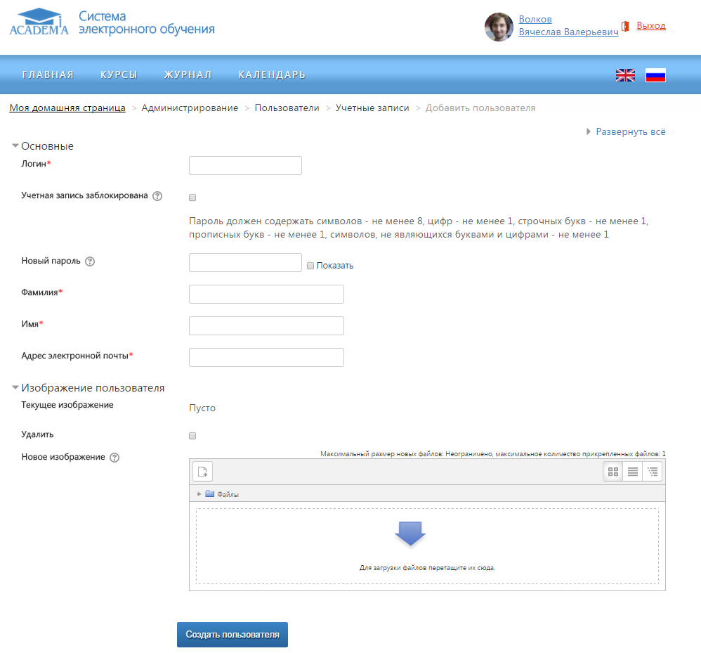 «Текущее изображение» — если изображение пользователя было загружено ранее, то оно будет отображаться в этом поле, а при добавлении нового пользователя поле «Текущее изображение» будет пустым;